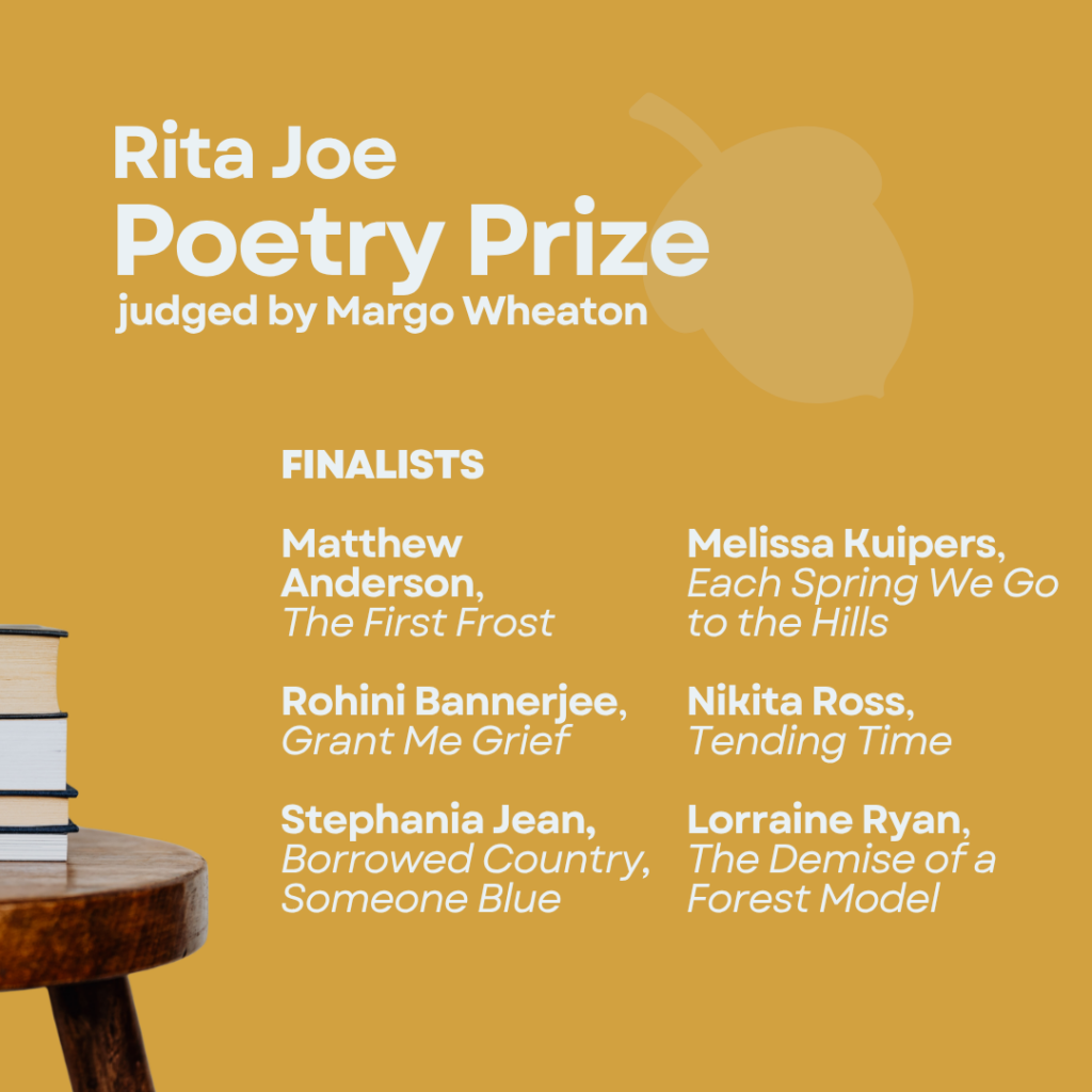This year’s Joe Prize judge, Margo Wheaton, is an award-winning poet and editor and is the author of Rags of Night in Our Mouths (McGill-Queen’s University Press, 2022) and Wild Green Light (with David Adams Richards, Pottersfield Press, 2021). She lives and writes in Halifax. Her debut poetry collection, The Unlit Path Behind the House (McGill-Queen’s, 2016), won the Fred Kerner Award (Canadian Authors’ Association) for Book of the Year and the Alfred G. Bailey Award from the Writers’ Federation of New Brunswick. It was also shortlisted for the Gerald Lampert Award, the J.M. Abraham Atlantic Poetry Award, the Fred Cogswell Award for Literary Excellence, and the Relit Award.