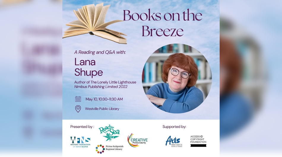 Books on the Breeze is presented by Read by the Sea in partnership with the Writers’ Federation of Nova Scotia and the Pictou-Antigonish Regional Library, and supported by Arts Nova Scotia and the Access Copyright Foundation.