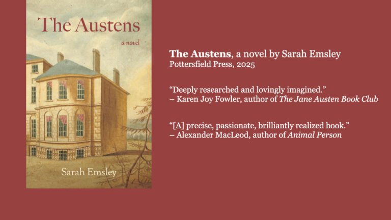 Sarah Emsley’s debut novel, The Austens, brings to life the story of Jane Austen’s friendship with her sister-in-law Fanny Austen, who lived for a while in Halifax, Nova Scotia, with her naval captain husband during the years when Jane was writing Pride and Prejudice and other novels that would eventually make her famous.