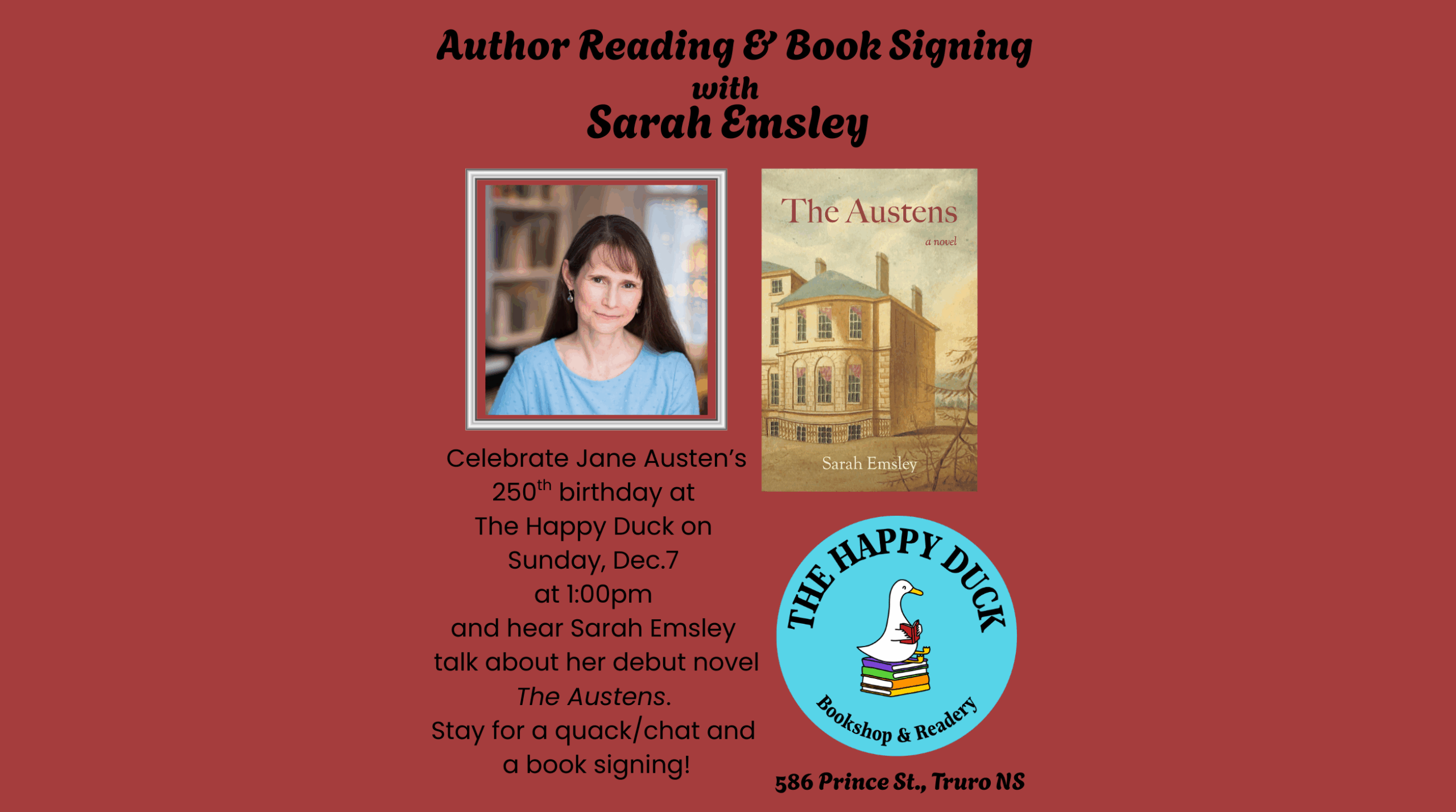 Join us for an author talk and book signing with Sarah Emsley. She’ll be talking about her debut novel, The Austens, about Jane Austen’s family and their connections to Halifax. We would love to see you!