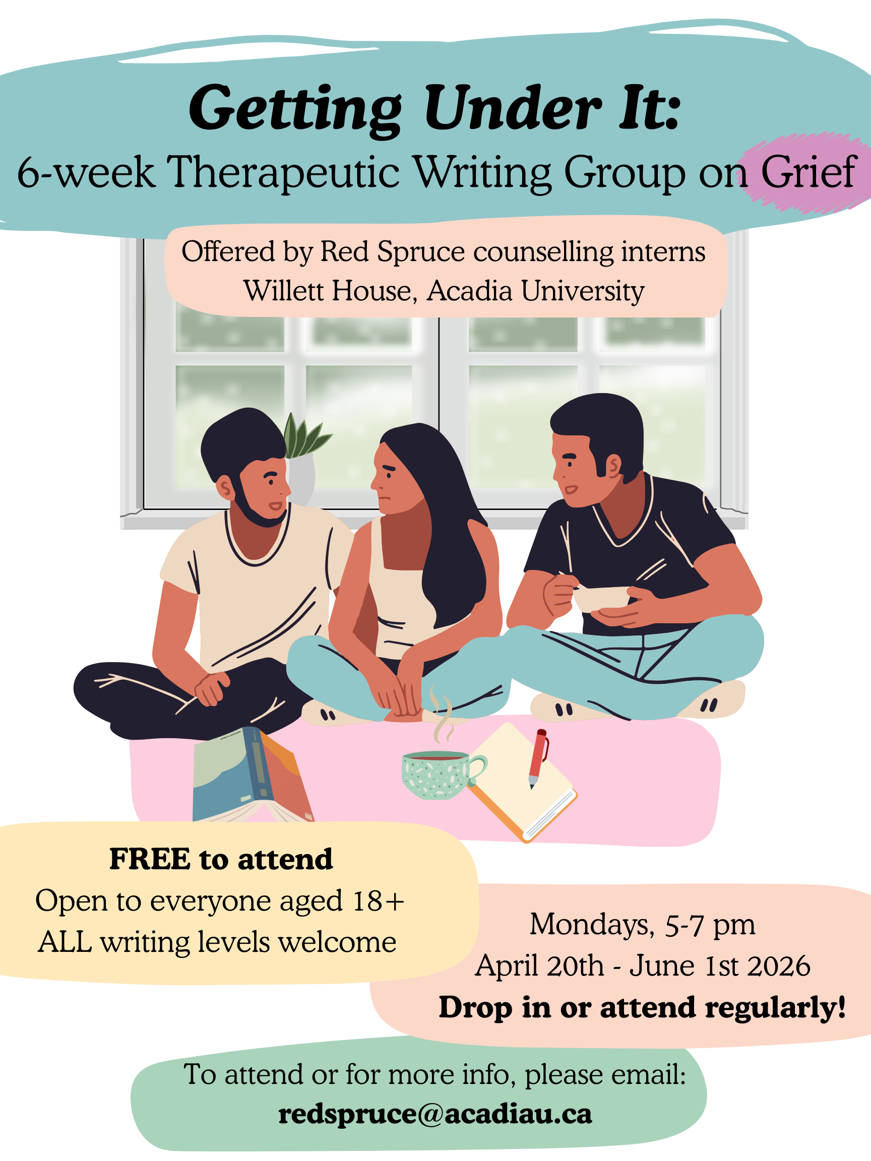 This is a 6-week therapeutic writing group on grief hosted by graduate counselling interns at the Red Spruce Mental Health Centre in Wolfville. Participants are welcome to drop-in or attend the 6-week series. If you are interested in attending, please contact redspruce@acadiau.ca