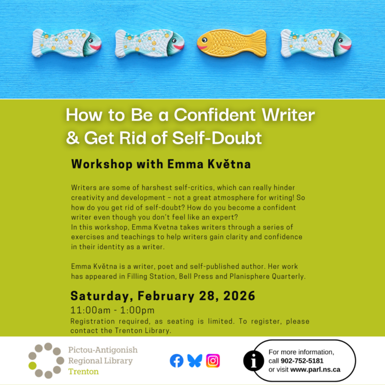 Please call the Trenton Library at (902) 752-5181 or email trenton@parl.ns.ca to register for this workshop since seating is limited.