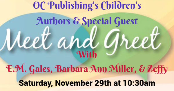 Join us for an informal Saturday morning author Meet & Greet with a few of OC Publishing’s Children’s authors: Author & Illustrator E.M. Gales (Orange Kitty and the Mouse Parade), Barbara Ann Miller (Zig Zag Zeffy), and special guest Zeffy!