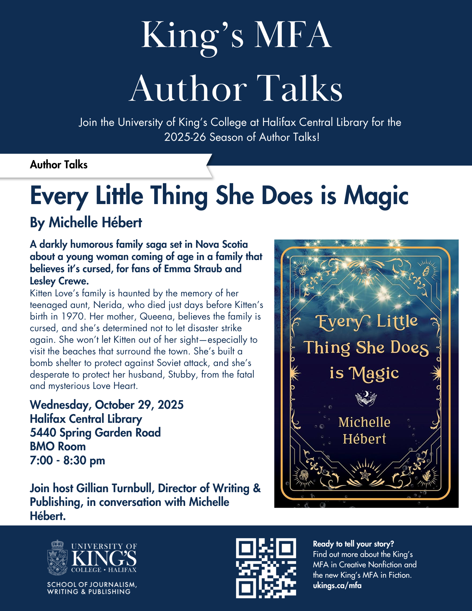 Join host Gillian Turnbull, Director of Writing & Publishing at the University of King’s College, in conversation with Michelle Hebert, author of Every Little Thing She Does is Magic.