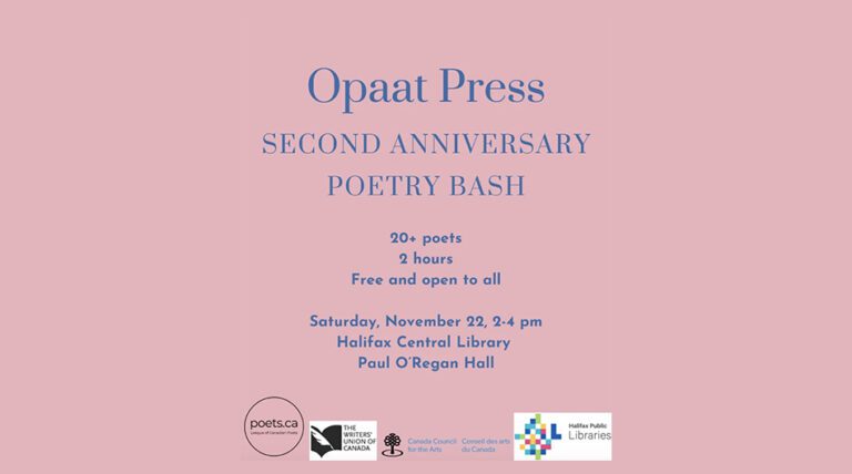 Save the date! The Opaat Press Second Anniversary Poetry Bash will take place at the Central Branch of the Halifax Library (in Paul O’Regan Hall) Saturday, November 22, from 2-4 pm. 2 hours, 20+ poets from across Atlantic Canada, event free and open to all. Supported by the League of Canadian Poets, The Writers’ Union of Canada, Canada Council for the Arts, and Halifax Public Libraries.