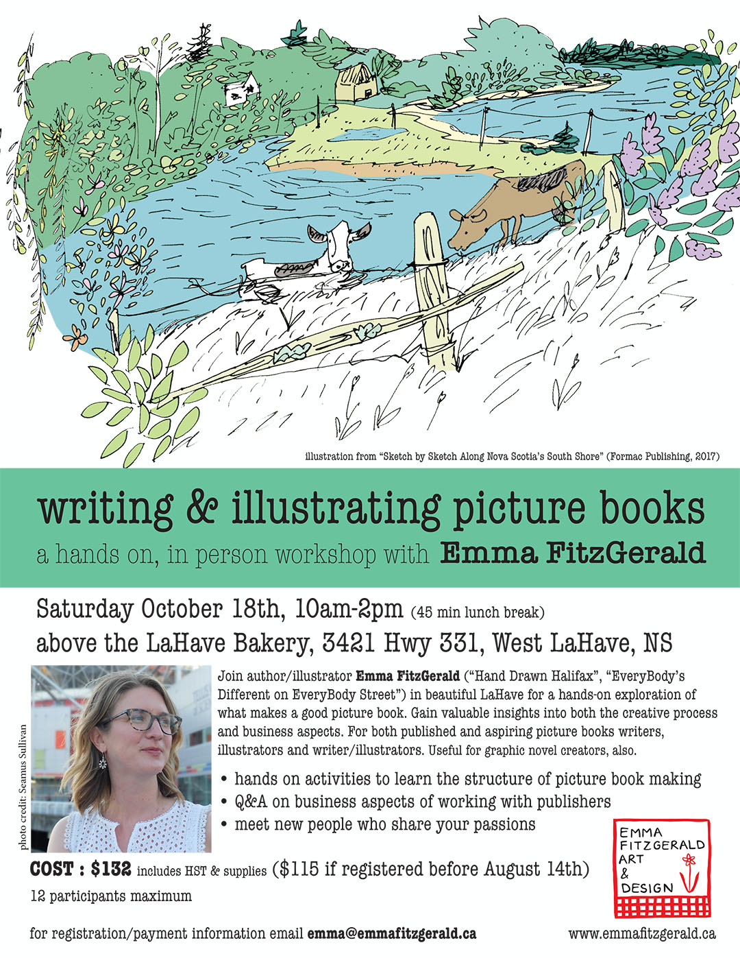 Join author/illustrator Emma FitzGerald (Hand Drawn Halifax, EveryBody’s Different on EveryBody Street) in beautiful LaHave for a hands-on exploration of what makes a good picture book.