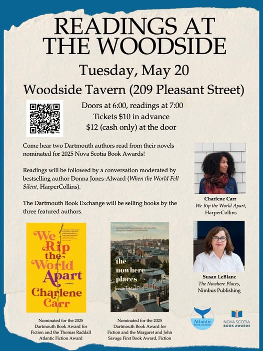 Come to Dartmouth’s oldest bar to hear two Dartmouth authors read from their novels nominated for 2025 Nova Scotia Book Awards: Charlene Carr (We Rip the World Apart, HarperCollins) and Susan LeBlanc (The Nowhere Places, Nimbus Publishing). The readings will be followed by a conversation moderated by bestselling author Donna Jones Alward (When the World Fell Silent, HarperCollins).