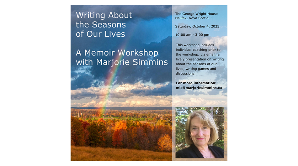 This workshop is open to emerging and established writers. Discussions on finding the heart of personal stories, and why telling the truth, writing into the emotional centre of things, will make your memoir a stand-out. The venue is a gracious Edwardian mansion in the South End. For more details: mls@marjoriesimmins.ca