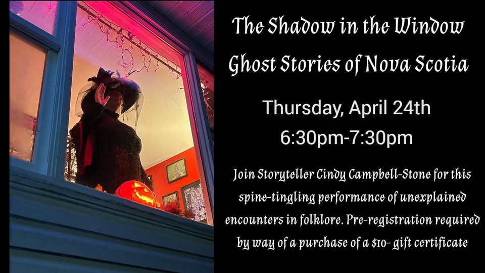 An abandoned house with shadowy windows, a hand that floats in the air, a grey lady that vanishes… these are the “things” that have been witnessed along Nova Scotia’s shores. Join storyteller Cindy Campbell-Stone for this spine-tingling performance of unexplained encounters in folklore. Advanced registration will be required by purchase of a $10 gift certificate to monitor our numbers.
