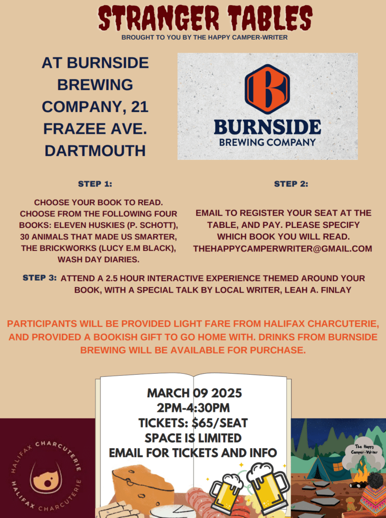 Stranger Tables ~ a celebration of how books bring people together. Tickets are limited, capped at 25 seats. Everyone who attends goes home with a special gift and will have the opportunity to enjoy an individual box of charcuterie provided by local business, Halifax Charcuterie. My intention is to host a literacy inspired event, promote books and reading, promote myself as a writer/author, but most of all provide a safe, low-stimuli, less crowded environment for people to meet one another, that’s what it’s all about 🙂