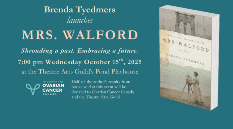 Hosted by Louise Renault. Featuring readings by historical fiction author Brenda Tyedmers and actors Rayna Smith-Camp and Debora Pollock, author interview and audience Q&A. Half of the author’s royalty from the event’s book sales will be donated to Ovarian Cancer Canada and the Theatre Arts Guild.