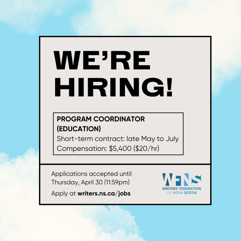 The Writers’ Federation of Nova Scotia (WFNS) is recruiting a short-term, part-time Program Coordinator (Education) to assist in membership resource development, communications, and special events planning.